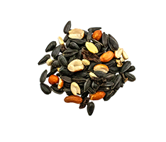Sunflower Seed, Peanuts, Safflower Seed, Dried Raisins, Dried Cherries, Mineral Oil, Dried Milk Protein, Ferrous Sulfate, Calcium Iodate, Copper Sulfate, Manganous Oxide, Magnesium Oxide, Zinc Sulfate, Vitamin B12, Niacin, Pyridoxine Hydrochloride, Thiamine Mononitrate, Vitamin A Supplement, Vitamin C (Ascorbic Acid), Vitamin E Supplement, Menadione Sodium Bisulfite Complex (Source of Vitamin K Activity), Vitamin D3 Supplement, Biotin, Choline Chloride, D-Calcium Pantothenate, Folic Acid, Riboflavin, DL-Methionine, L-Lysine Monohydrochloride, Potassium Chloride, Sodium Bicarbonate, Fructooligosaccharides, Ethylenediamine Dihydroiodide, Flax Seed Oil, Artificial Flavor.